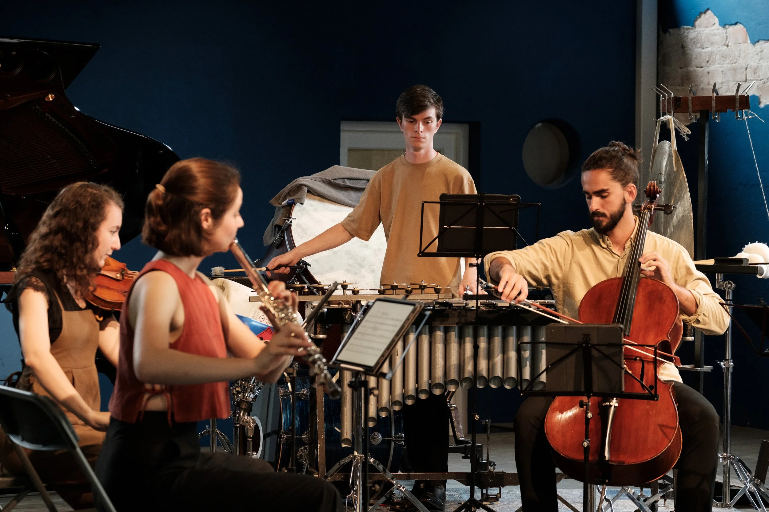 We begin outdoors where audiences and musicians record sound, transitioning inside into an immersive blend of these live-recorded sounds. From there, objects and music come together